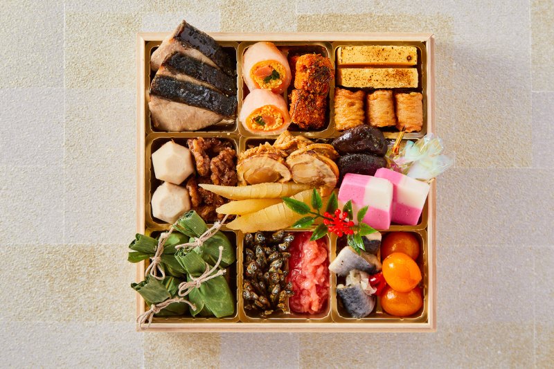 参ノ重 | 金柑蜜煮、にしんマリネ、帆立柚子明太、田作り、笹大福、カスタード オーロラ包み、紅白市松蒲鉾、椎茸甘露煮、味付け数の子、照焼帆立、かつおくるみ、海老芋八方煮、薩摩ピリ辛天、玉子チーズ、まだら子の旨煮、錦糸砧巻き、ブリ照焼 計17品 |